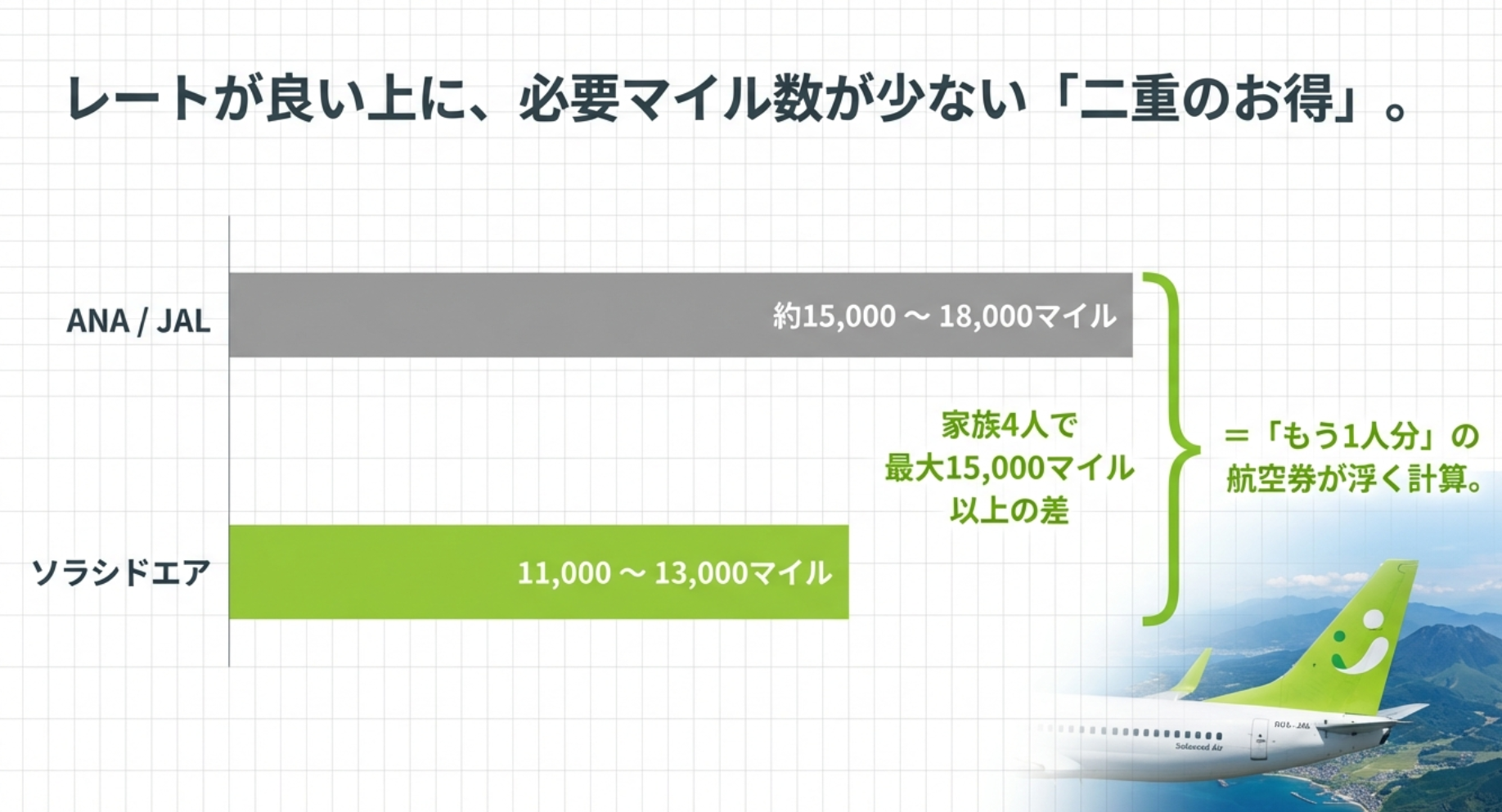 このように、ソラシドエアなら1人あたり数千マイルも少なく済みます。
