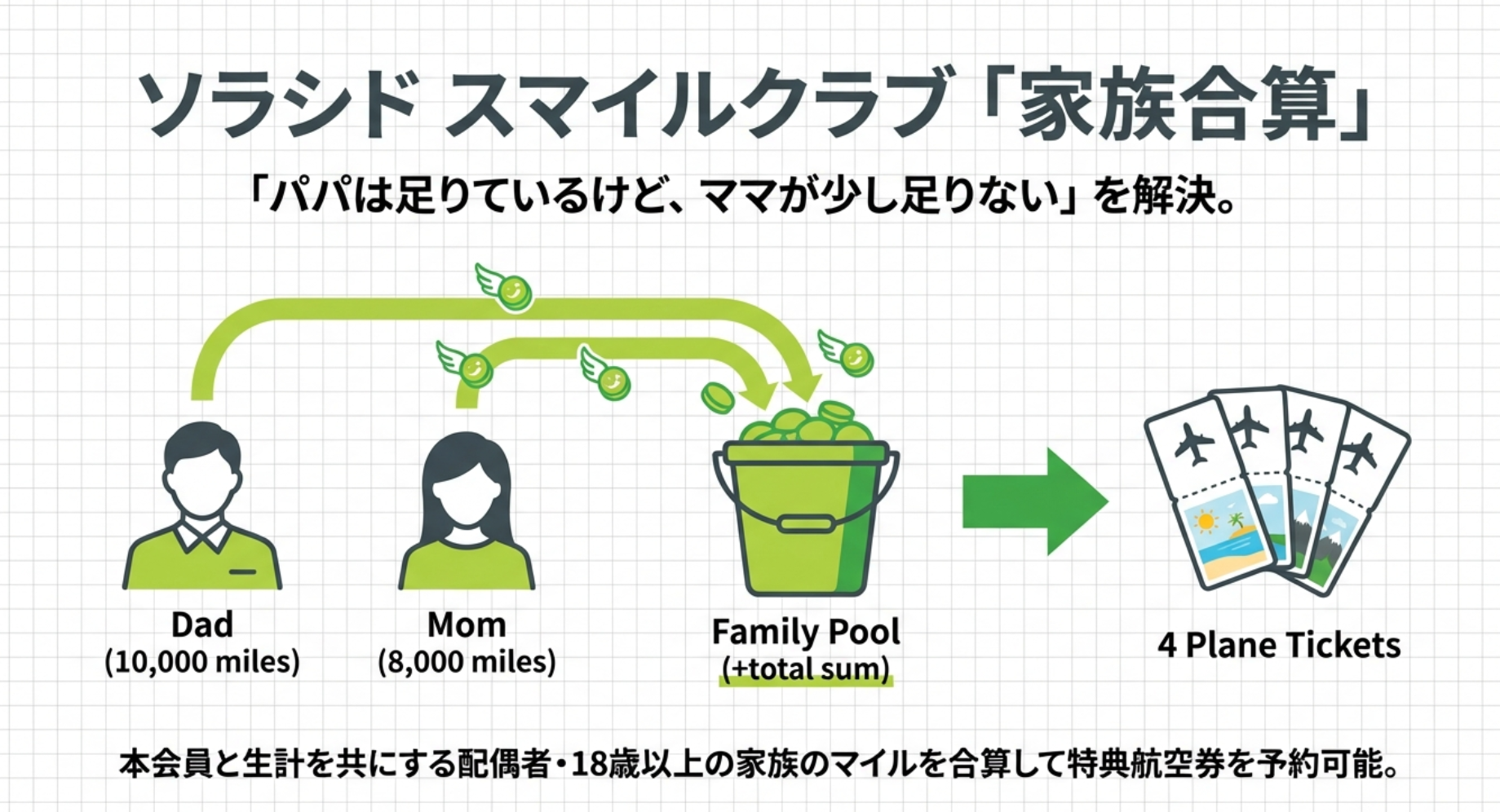 ソラシドエアには、家族間でマイルを合算できる「ソラシド スマイルクラブ 家族合算」という便利な仕組みがあります。