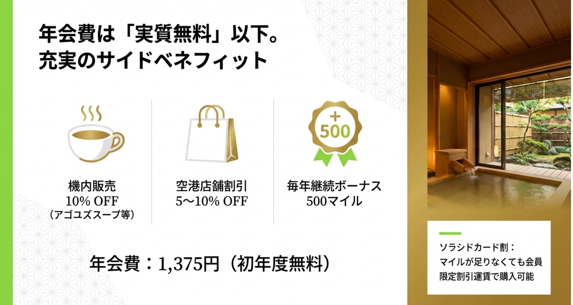浮いた年会費分を、現地でのレンタカー代や温泉の貸切風呂代に回す方が満足度は高まるでしょう。