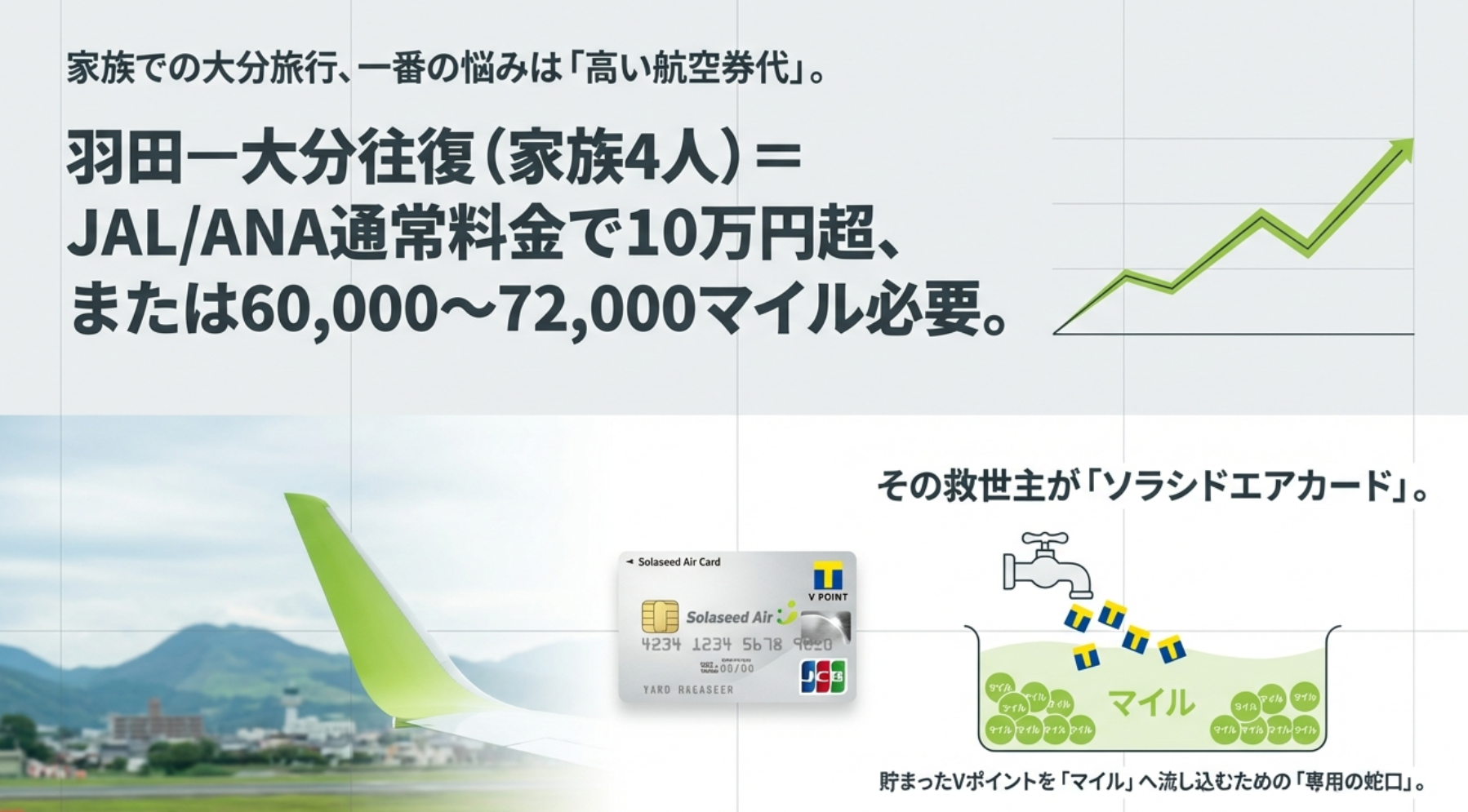 - 効率性: 家族それぞれがソラシドエアカードを持つことで、入会キャンペーンのマイルも人数分獲得でき、一気に大分旅行が現実味を帯びます 。